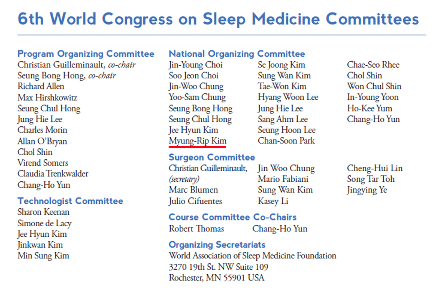 서울일리노이치과 김명립원장은 2015년 3월 21일부터 3월 25일까지 서울 KOEX에서 열린 제 6회 세계수면학회 (6th World Congress on Sleep Medicine by WASM)에서 조직위원, 학술위원으로 일했어요, 또, 서울일리노이치과 원장은 Stanford University Sleep Center의 Guilleminault 교수님이 주최한 코스에 전세계 유명한 이비인후과, 소아과, 호흡기내과 , 신경과 교수님들과 같이 초청받아 "호흡,구호흡 성장발육, 수면장애, 무턱교정치료"에 대해 45분동안 강의 했어요. 세계수면학회는 호흡과 성장발육, 수면장애를 연구, 진료하는 전세계 유명한 이비인후과, 소아과, 호흡과내과, 신경과, 정신과, 치과, 치과교정과 교수들의 학술대회예요.